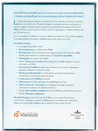 Biblia de una joven conforme al corazón de Dios - Edición Brisa acompaña a la lectora en un viaje de crecimiento espiritual, ofreciendo guía, consuelo y sabiduría práctica para la vida cotidiana. Escrita por Elizabeth George, recoge la experiencia de una autora con más de treinta años enseñando la Palabra, para ayudar a cada joven a conocer la vida que Dios desea para ella y a fortalecer su relación con Él.