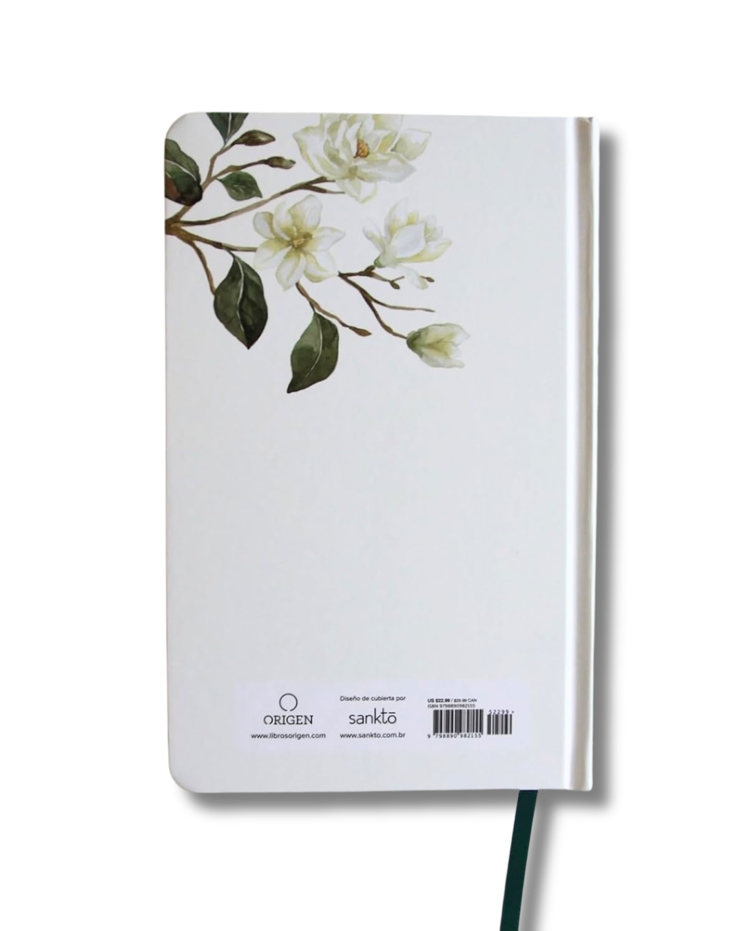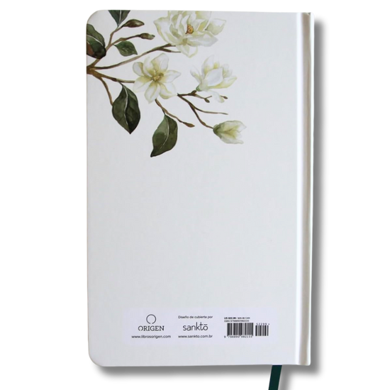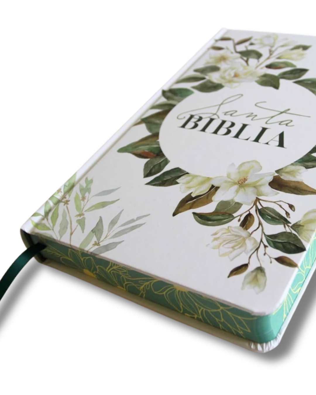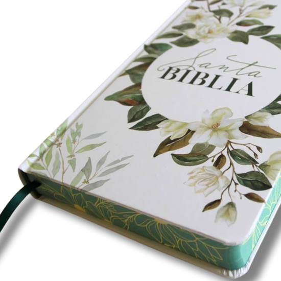 Biblia tamaño manual, ultrafina y con letra grande. Tapa dura con flores blancas, cinta marcadora, y estudio conciso de los nombres de Dios.