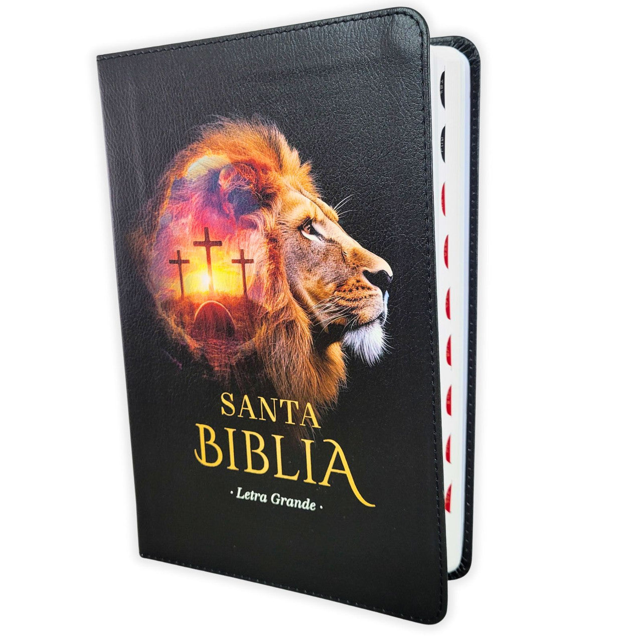 Presenta una cubierta en símil piel color negro con diseño de león y cruces, que aporta un estilo sobrio y distintivo. Su tamaño manual facilita transportarla a la iglesia, grupos de estudio o llevarla en el día a día sin perder comodidad de lectura.