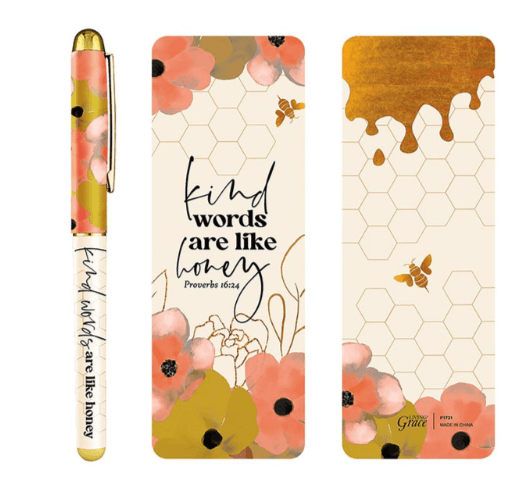 El bolígrafo y el marcapáginas dicen Las palabras amables son como la miel - Proverbios 16:24