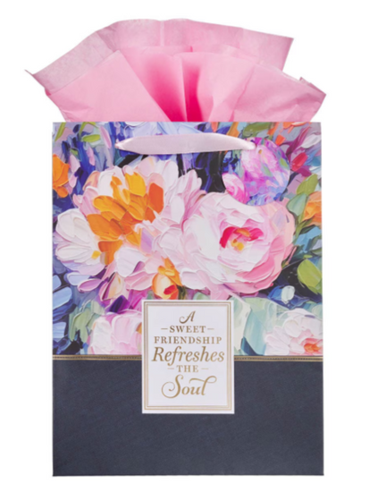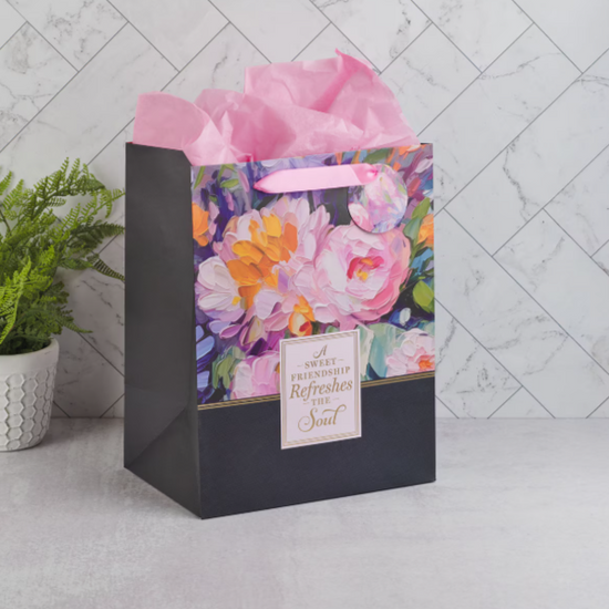 El diseño audaz y hermoso de la Bolsa de Regalo Grande con Retrato "Dulce Amistad Jardín de Acuarela" celebra el preciado vínculo de la amistad. Es la manera perfecta de presentar un regalo de agradecimiento o una sorpresa "porque sí".