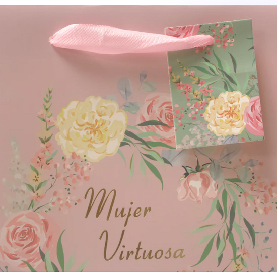 Esta bolsa de regalo mediana “Mujer virtuosa” en tono rosado con delicadas flores es el detalle perfecto para expresar admiración y cariño. Su tamaño ideal permite presentar obsequios con elegancia y estilo, mientras que su diseño floral evoca feminidad y buen gusto. Convierte cualquier regalo en un momento especial con esta bolsa que celebra la belleza y fortaleza de la mujer virtuosa.