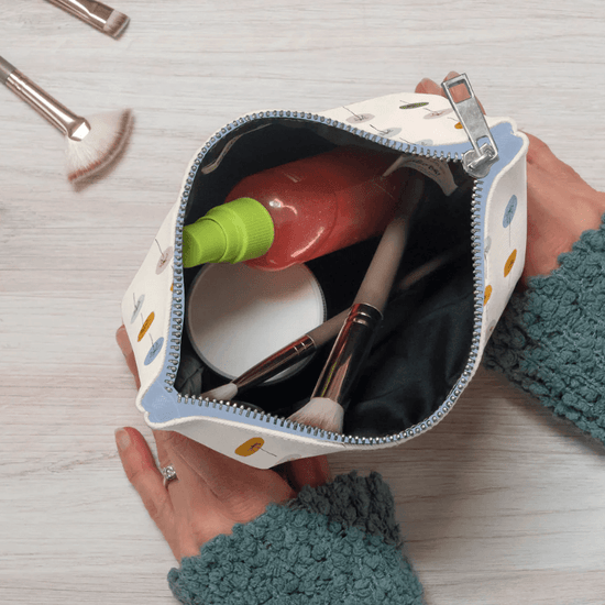 Un bolso de mano de Studio Oh! tiene el tamaño perfecto para empacar los imprescindibles para los retoques sobre la marcha. Diseñada para la función y la belleza, esta bolsa portátil está hecha de material PU resistente al agua, completamente forrada y adornada con arte a todo color y una cremallera de metal. Mantente fiel al estilo mientras mantienes los cosméticos seguros y protegidos.
