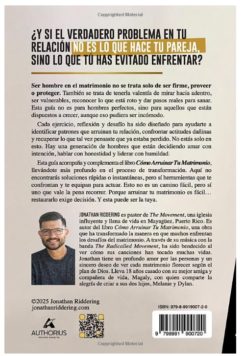 Esta guía fue diseñada para ayudarte a confrontar los errores más comunes que cometen los hombres en su relación y que, sin darse cuenta, pueden estar destruyendo lo que más aman. Es el complemento perfecto al libro Cómo Arruinar Tu Matrimonio, y te acompañará paso a paso en una jornada de reflexión, cambio y restauración.