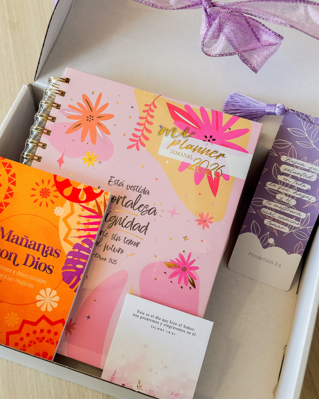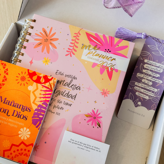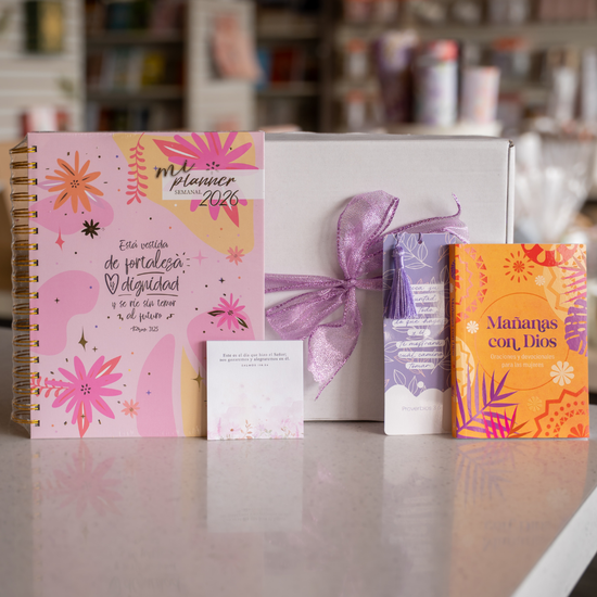 Un regalo diseñado para acompañar el corazón y la vida diaria de cada mujer que busca caminar con propósito. Este conjunto reúne herramientas devocionales y detalles inspiradores que convierten lo cotidiano en un espacio de encuentro con Dios: