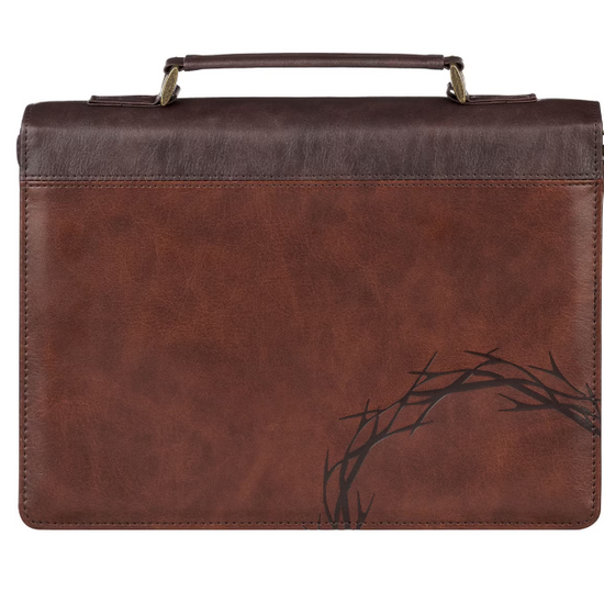 La Funda Clásica de Biblia de Cuero Sintético Marrón con Corona de Espinas es un recordatorio solemne y maravilloso de que hemos sido comprados a un precio. Envuelve tu Biblia en esta funda protectora y deja que te recuerde que en temporadas de quebranto y entrega, por Sus llagas, somos sanados.La funda de la Biblia tiene un diseño marrón de dos tonos con una cubierta de letra color castaño que está estampada en caliente con una corona de espinas en la esquina inferior derecha. Este panel está conectado a cuero sintético color espresso que rodea el lomo y cubre la parte trasera. La costura superior resistente alrededor de los bordes y las uniones asegura una conexión fuerte. La cubierta trasera tiene un bolsillo, donde encontrarás un versículo de la Escritura en foil dorado que respalda el diseño de la cubierta.Él fue herido por nuestras transgresiones,Él fue molido por nuestras iniquidades;el castigo de nuestra paz fue sobre Él,y con Sus llagas fuimos sanados.Isaías 53:5