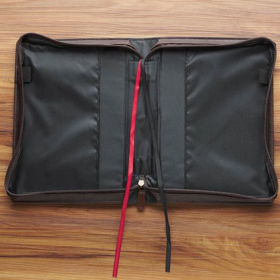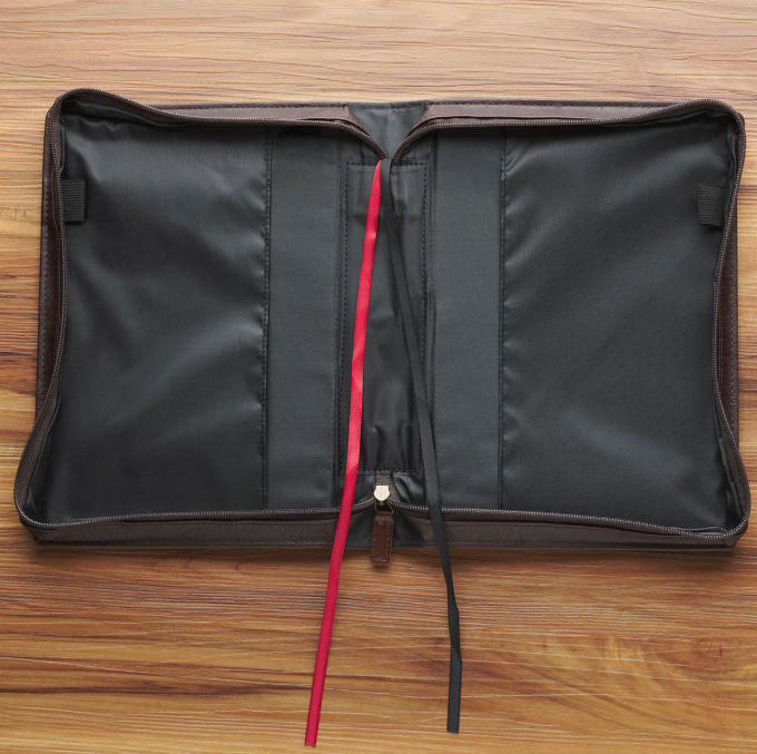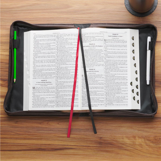 Esta clásica funda de Biblia, con su recordatorio significativo, también es protectora y funcional. Cuenta con un resistente asa de cuero sintético color café espresso que se mantiene plana y está anclada con herrajes de latón antiguo. La cremallera envolvente tiene un cierre dorado antiguo con un deslizamiento suave y una lengüeta de cuero sintético. En el interior, dos elásticos para bolígrafos sostienen de manera segura los bolígrafos o resaltadores, y dos marcadores de cinta de satén—uno negro y uno rojo oscuro—ayudan a mantener tu lugar.