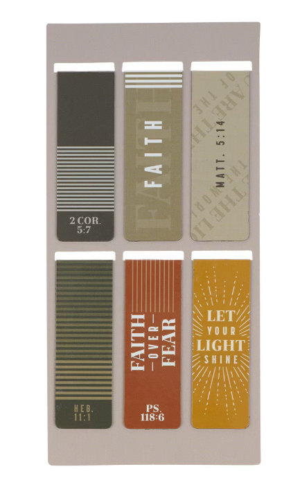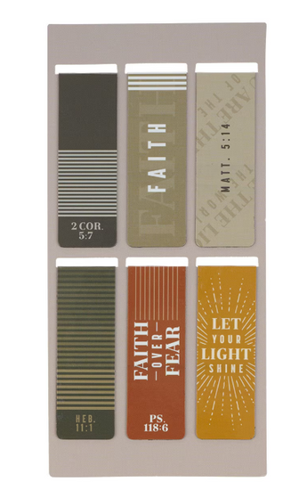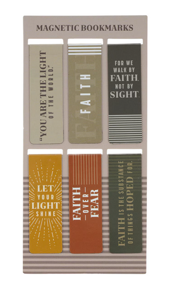 El Juego de Marcadores Magnéticos Fe y Luz es un recordatorio fuerte y constante de que la Palabra de Dios ilumina el camino, y puedes dar un paso de fe, incluso cuando el camino no está claro. Estos marcadores audaces te ayudarán a mantener tu lugar mientras mantienes tu enfoque en Él. Este juego incluye seis marcadores magnéticos impresos con tonos tierra suaves, líneas limpias y mensajes inspiradores. Los sentimientos aparecen en letras mayúsculas fuertes en el frente, mientras que las referencias bíblicas se aplican en la parte posterior.