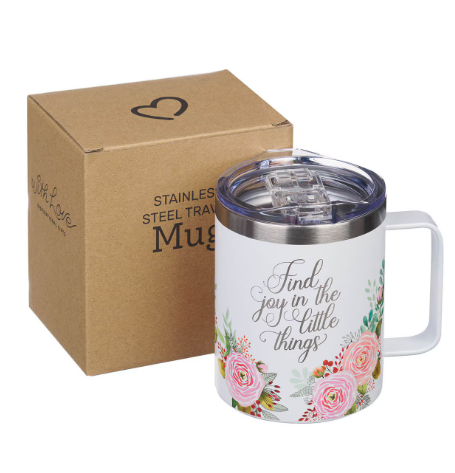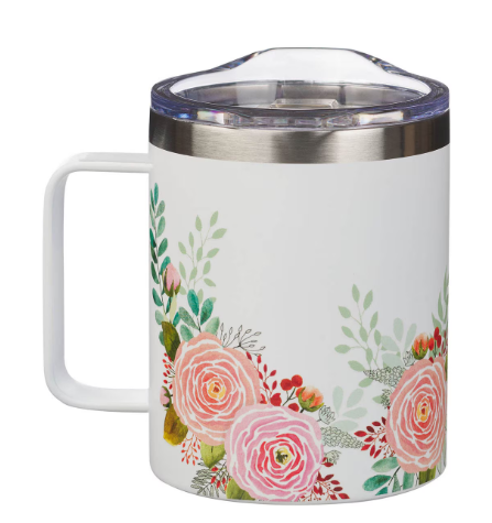 La taza de acero inoxidable estilo campamento Find Joy Pink Floral es perfecta para viajes en automóvil, desplazamientos al trabajo o aventuras de campamento. Mantén tu bebida favorita caliente o fría y concéntrate en las cosas buenas de la vida mientras la disfrutas sobre la marcha.Esta taza de acero inoxidable con aislamiento de doble pared es blanca en la mitad superior y multicolor en la parte inferior, representando una escena de jardín con rosas rosas, hojas verdes y otras pequeñas flores coloridas que brotan desde su base. En el frente, el mensaje está grabado con láser en una fuente cursiva plateada.Encuentra alegría en las pequeñas cosas.La tapa transparente, libre de BPA, cuenta con una cubierta deslizante en la abertura para beber, que ayuda a prevenir derrames mientras estás en movimiento. Diseñada en un estilo clásico de taza de campamento, este vaso de acero inoxidable tiene una base amplia para mayor estabilidad y un asa robusta en forma de D, de gran tamaño, que ofrece un agarre cómodo. Un sello de silicona ajustado alrededor de la tapa agrega una capa extra de protección contra derrames, ideal para mañanas ajetreadas o días de viaje.