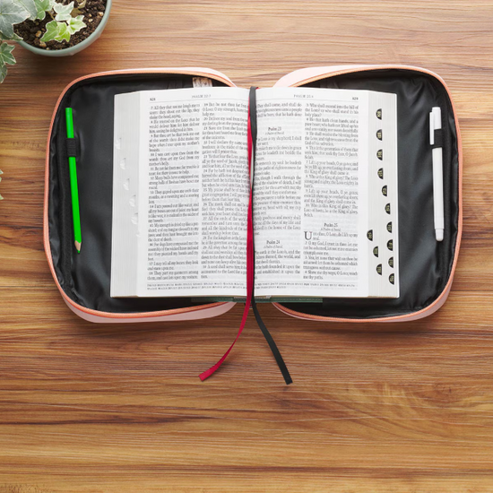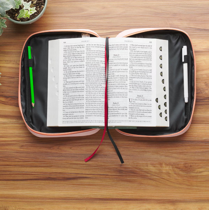 Cuando la vida se siente un poco abrumadora, o no estás seguro de lo que sigue, la Funda de Biblia de Moda en Cuero Sintético Floral Durazno "Confía en el Señor" está allí para recordarte que debes dejar ir y confiar en el plan de Dios. Mantiene tu Biblia segura y Su promesa cerca de tu corazón.Un bolsillo con cremallera en la portada de cuero sintético durazno brillante tiene impreso un alegre ramo de flores blancas, coral y rosa pálido. El sentimiento se encuentra justo encima del ramo de flores en letras amarillas en forma de panal. El bolsillo tiene una cremallera coral brillante y un tirador de cremallera de metal dorado.Confía en el Señor con todo tu corazón y no te apoyes en tu propio entendimiento Proverbios 3:5