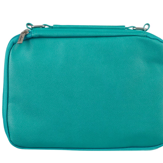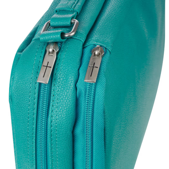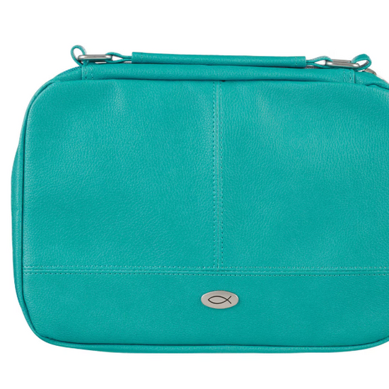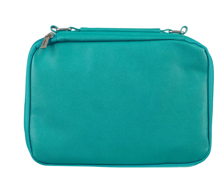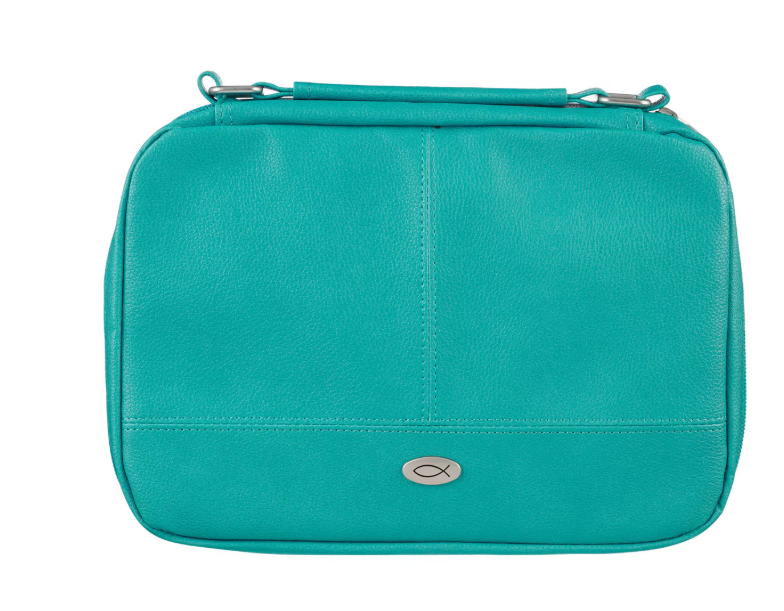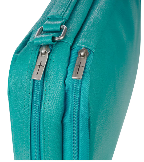 Añade un refrescante toque de color al estudio bíblico con la funda para Biblia con organizador de cuero sintético turquesa de dos pliegues, la combinación perfecta de estilo y funcionalidad para una mujer en movimiento. Con su alegre tono turquesa, esta funda de Biblia organizadora para mujer destaca mientras mantiene todo lo que necesita en un solo lugar. Las costuras de triple panel, los tiradores de cremallera con cruz grabada en plata, los herrajes de asa plateados y el emblema de Icnhthus plateado añaden detalles llamativos y centrados en la fe. El estuche tiene dos compartimentos con cremallera para proporcionar almacenamiento para su Biblia, diario, notas y bolígrafos. Una sección cuenta con un bolsillo deslizante para el bloc de notas incluido, tres ranuras para tarjetas y cuatro bucles para bolígrafos. La segunda opción ofrece soportes deslizantes para la Biblia en la Biblia, un bolsillo de malla con cremallera y otro lazo para bolígrafo con una práctica combinación de bolígrafo y resaltador amarillo.