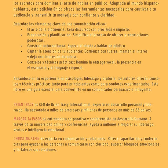 A lo largo del texto encontrarás estrategias prácticas para cultivar confianza, claridad y presencia ante cualquier audiencia: desde captar la atención inicial hasta manejar la voz, el lenguaje corporal, el humor y las historias con integridad. Brian Tracy comparte técnicas aplicables, mientras que Margarita Pasos y Christina Stein enriquecen el contenido con ejemplos que facilitan llevar la teoría a resultados concretos, recordando que cualquiera puede aprender a comunicarse con impacto.