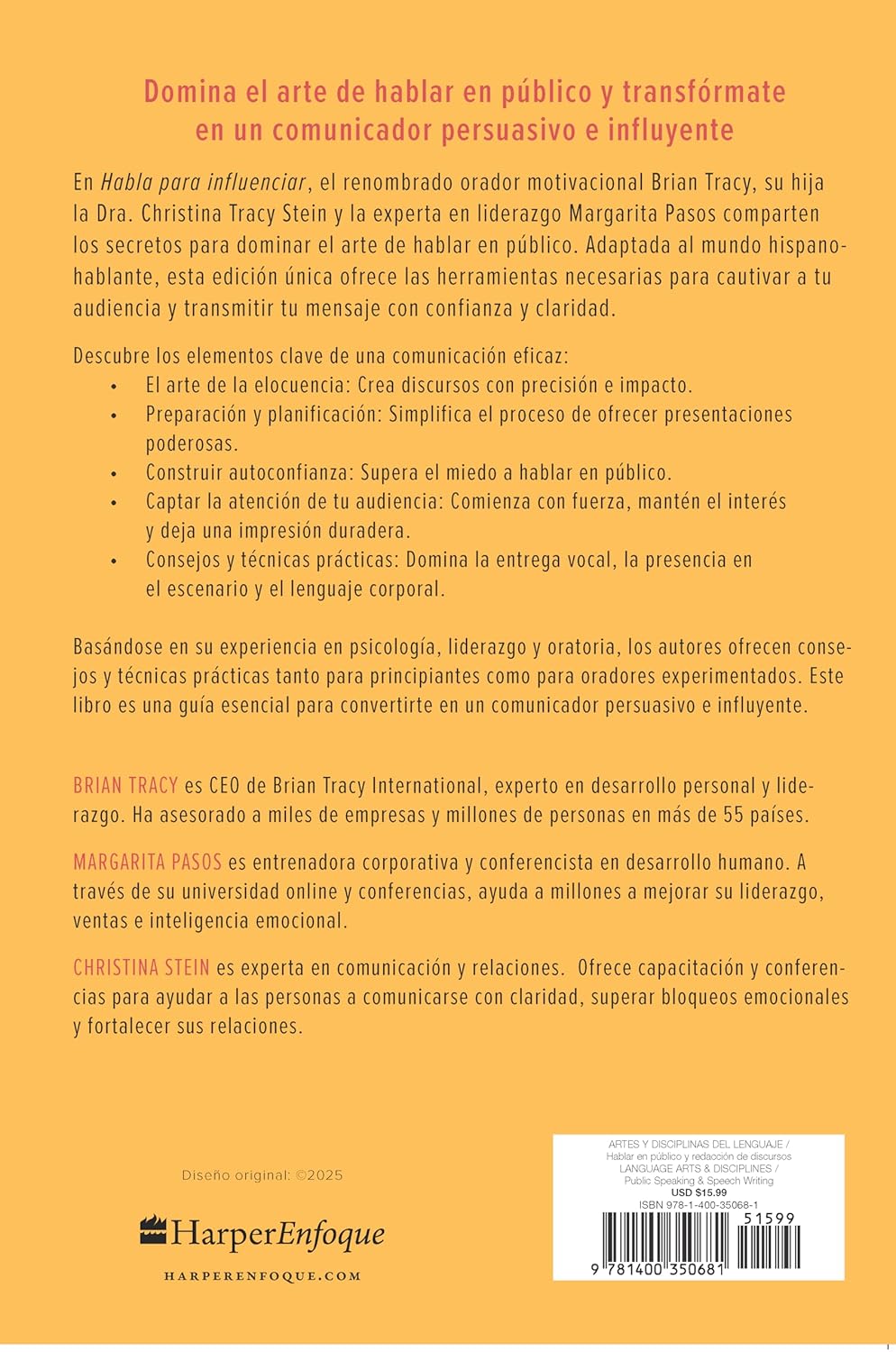 Habla para influenciar, de Brian Tracy con las aportaciones de Margarita Pasos y Christina Stein, te invita a descubrir tu voz y a comunicar con intención y autenticidad. Con un tono cercano y alentador, propone transformar el miedo escénico en oportunidades para persuadir, impactar y servir desde la coherencia personal.