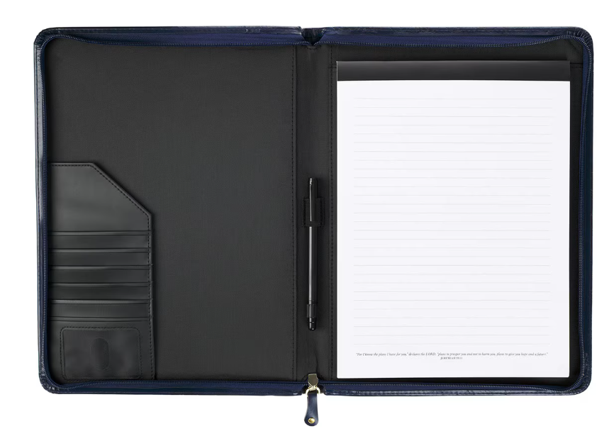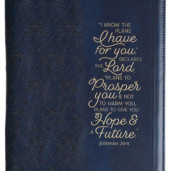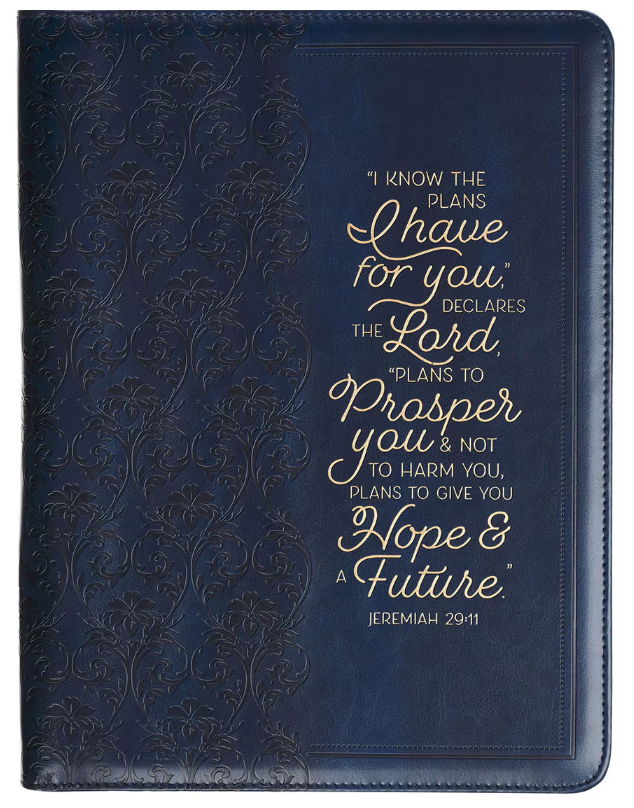 La carpeta ejecutiva I Know the Plans Flowering Trellis en cuero sintético azul marino es un regalo ideal para los graduados. Su mensaje motivador los inspirará a soñar en grande y avanzar con confianza, sabiendo que Dios tiene un plan para su futuro.Un elegante diseño de enrejado estampado con calor adorna la cubierta de cuero sintético azul de la carpeta. El patrón comienza en la parte trasera, rodea el lomo y llena la mitad de la portada, deteneniéndose en un panel liso que está dorado en relieve con el mensaje."Porque yo sé los planes que tengo para vosotros", declara el SEÑOR, "planes de bienestar y no de calamidad, para daros esperanza y un futuro."Jeremías 29:11