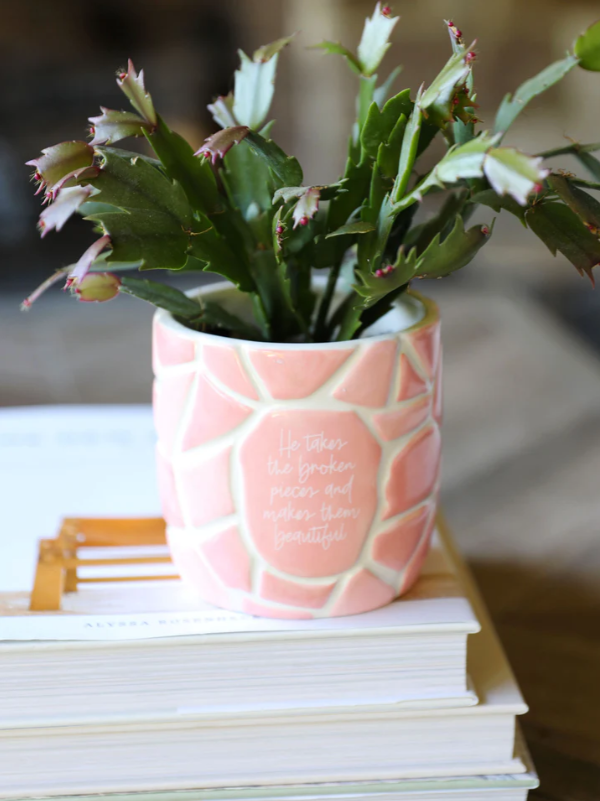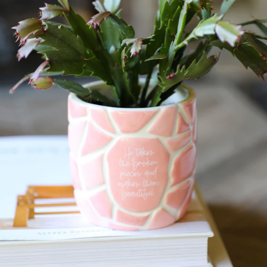 Tal como la promesa del Señor en Eclesiastés 3:11, la Maceta Alma Reparada transmite la belleza del proceso de sanación de la vida. Al unir sus fragmentos rotos en un hermoso diseño de mosaico, esta maceta representa cómo Dios toma nuestras piezas rotas y nos reconstruye, pieza por pieza, llenando las grietas con su amor.
