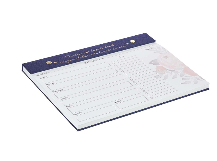 Planner Best teacher | Mejor maestra(o) es un gesto tierno y agradecido para reconocer a quien siembra conocimiento y esperanza en la vida de los niños. La cubierta en azul marino con elegantes letras doradas y pequeños corazones, junto al delicado motivo de peonías que acompaña las páginas, hace de este planificador una expresión de gratitud y belleza hacia la vocación docente.