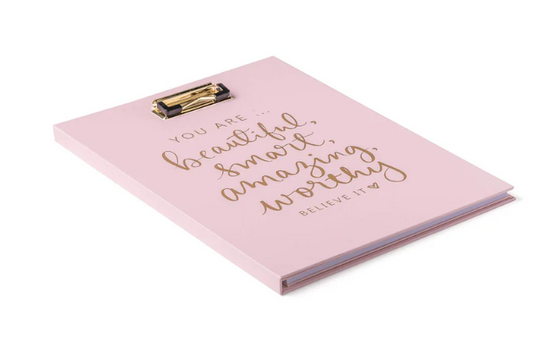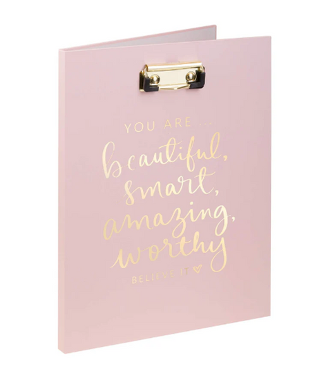 Este portapapeles de Dayna Lee con diseño de almacenamiento cuenta con una cita escrita en lámina dorada: "Eres hermosa, inteligente, increíble, digno. Believe It" .