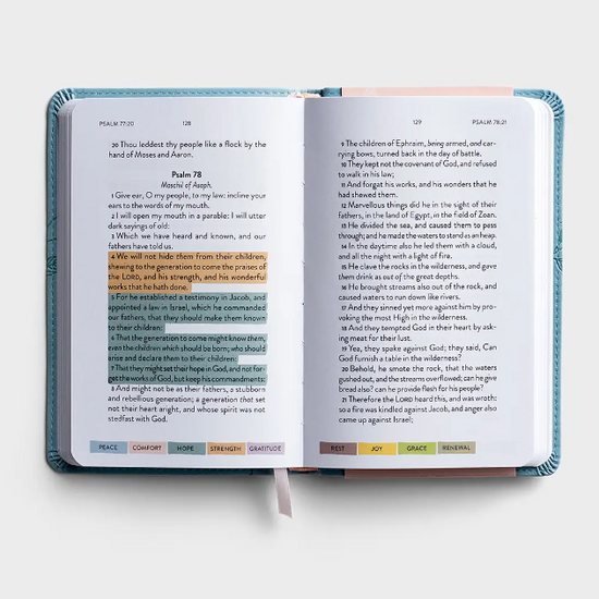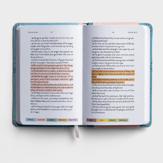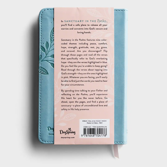 En Santuario en los Salmos, encontrarás un lugar seguro para liberar todas tus preocupaciones y preocupaciones en las manos seguras y amorosas de Dios. Santuario en los Salmos presenta nueve temas codificados por colores que incluyen paz, consuelo, esperanza, fortaleza, gratitud, descanso, alegría, gracia y renovación. ¿Estás desanimado? Hojee estas páginas y lea todos los versículos que se refieren específicamente a la esperanza eterna de Dios: son los versículos resaltados en azul. ¿Sientes que eres incapaz de seguir adelante? Lee los versículos sobre cómo aprovechar la fuerza de Dios, son los que están resaltados en rosa. Sea lo que sea que estés enfrentando, fácilmente podrás encontrar las palabras que necesitas escuchar para tu circunstancia. Pasando tiempo hablando con tu Padre y reflexionando sobre los Salmos, experimentarás Su corazón por ti como nunca antes. Adelante, abre las páginas y encuentra un lugar de santuario, un lugar de amor incondicional y seguridad en Su santa presencia.