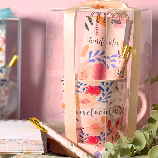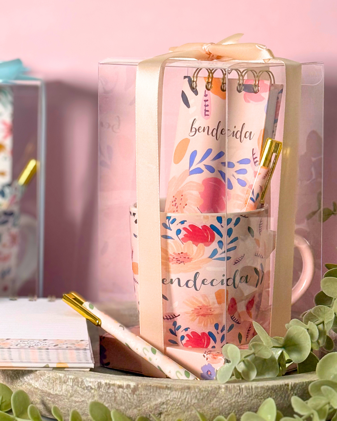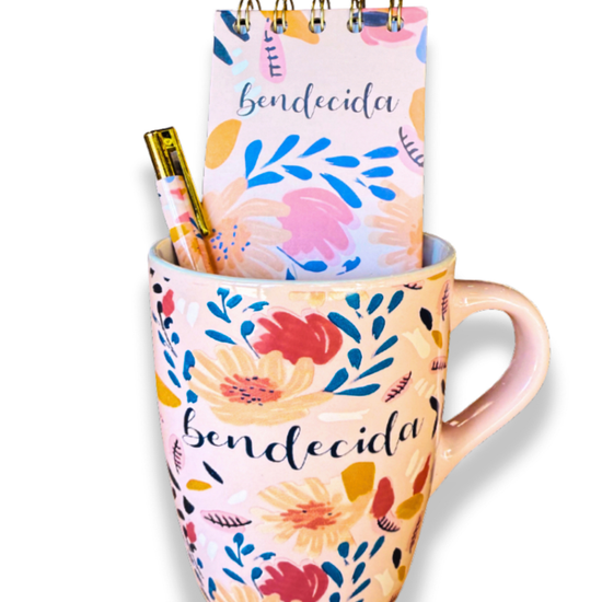 Incluye: - Taza: Capacidad de 12 oz, con asa pintada y un diseño en calcomanía a todo color. Fabricada en cerámica con un esmalte blanco que resalta su acabado elegante. - Libreta: Tamaño compacto (70 mm x 150 mm) con cubierta dura. Contiene 60 hojas de 95 gsm con impresión a todo color y diseños variados en su interior. - Bolígrafo: Diseño a juego con la libreta y la taza, agregando armonía y estilo al conjunto.