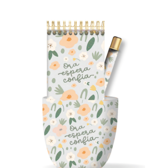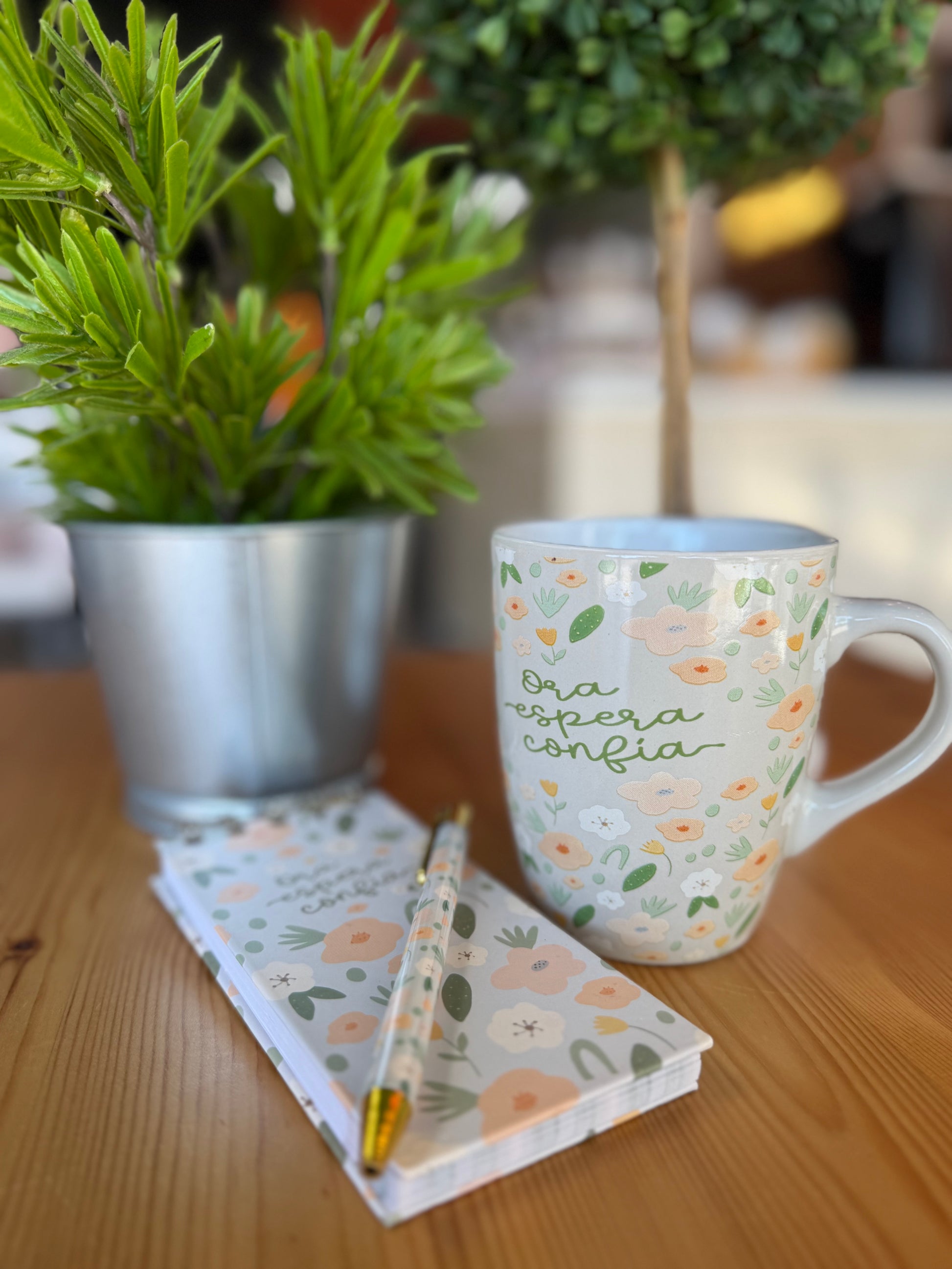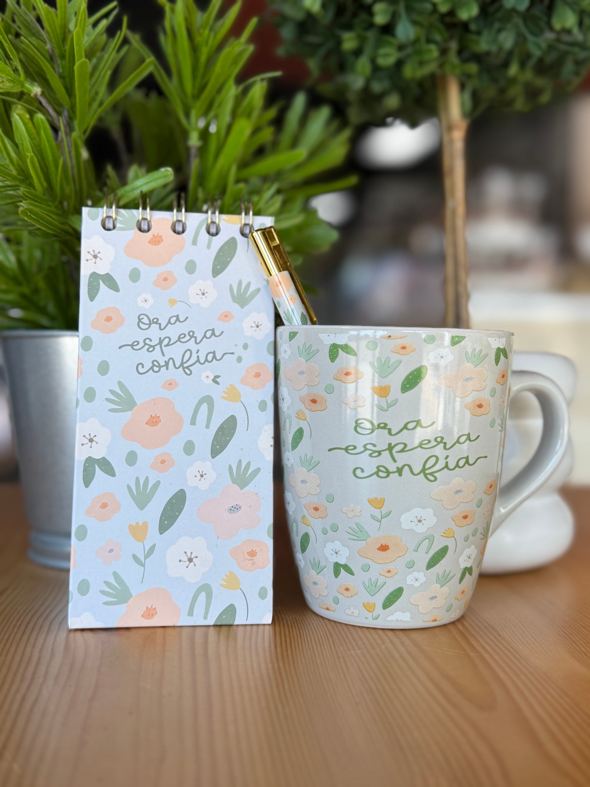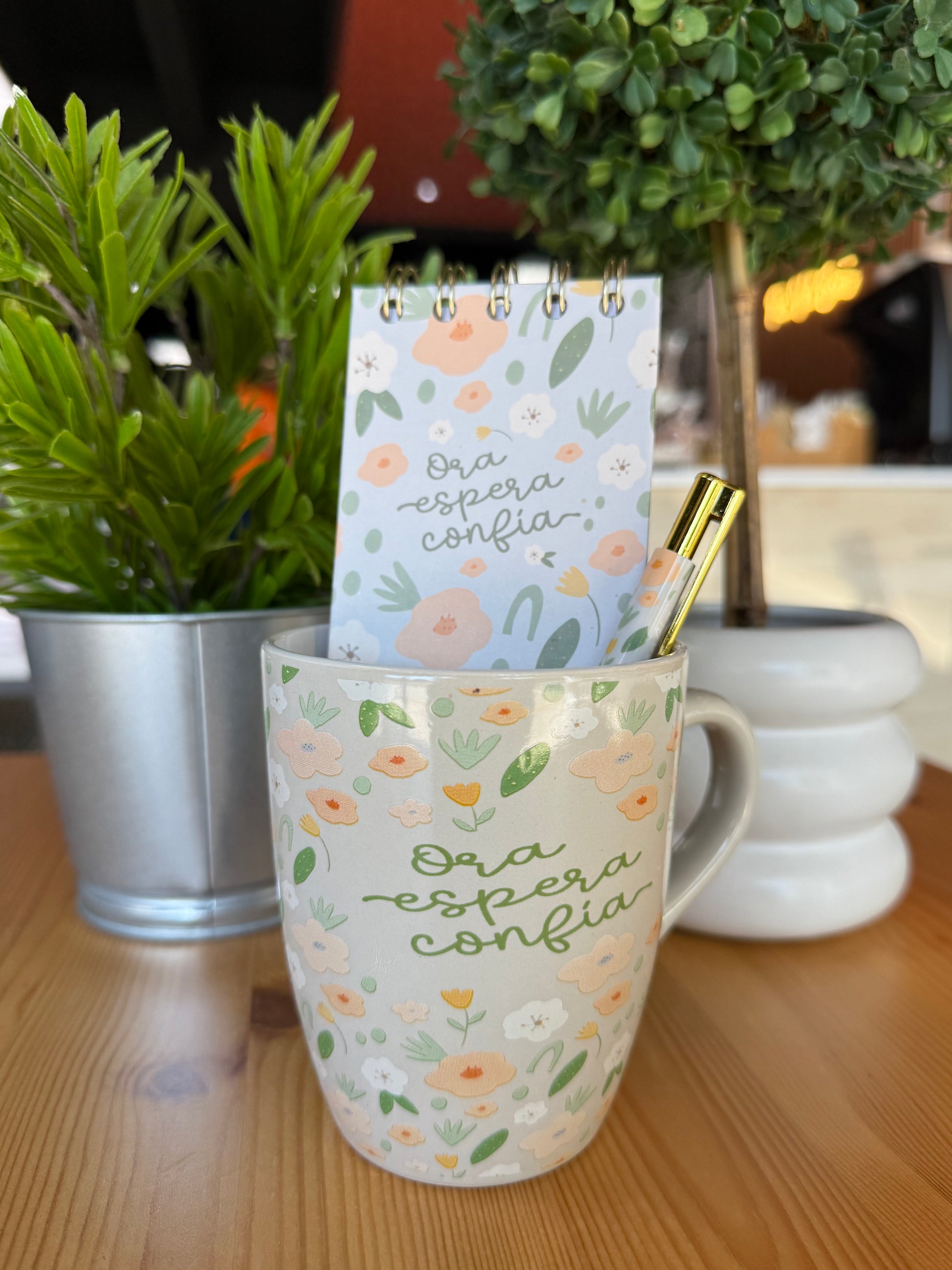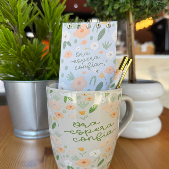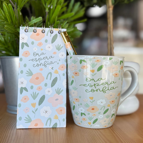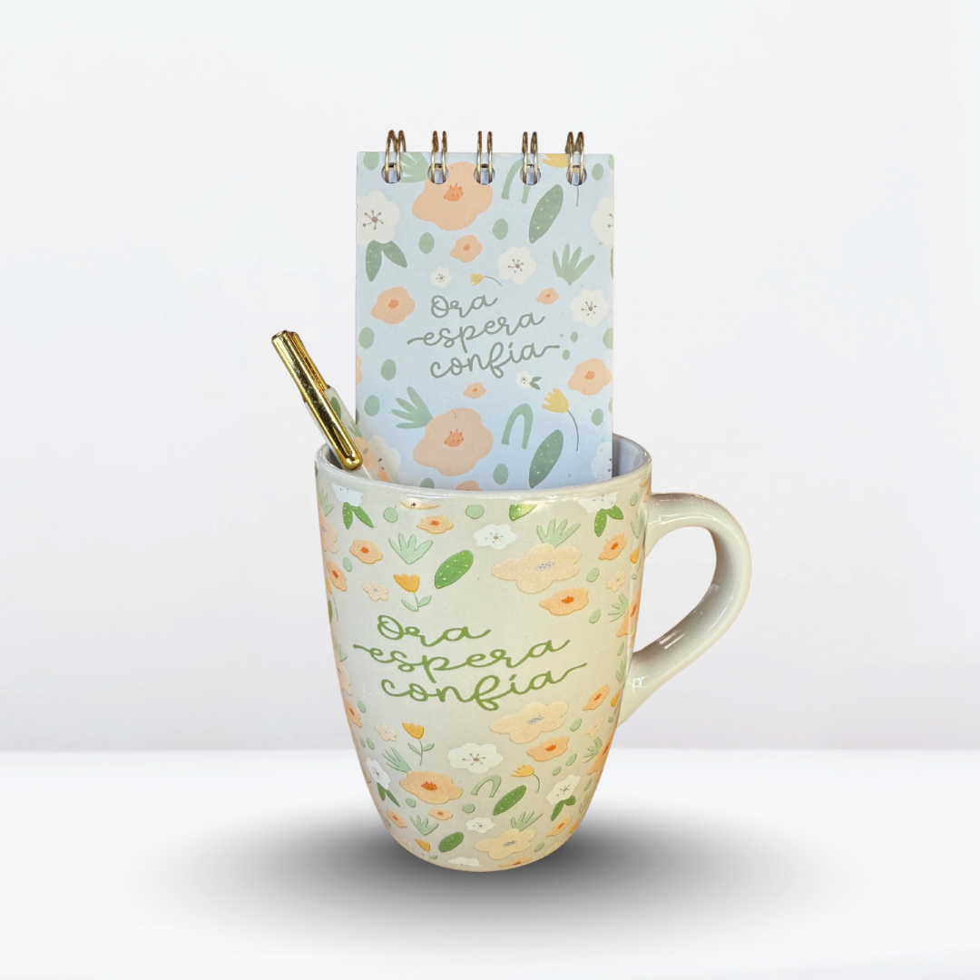 Incluye: - Taza: Capacidad de 12 oz, con asa pintada y un diseño en calcomanía a todo color. Fabricada en cerámica con un esmalte blanco que resalta su acabado elegante. - Libreta: Tamaño compacto (70 mm x 150 mm) con cubierta dura. Contiene 60 hojas de 95 gsm con impresión a todo color y diseños variados en su interior. - Bolígrafo: Diseño a juego con la libreta y la taza, agregando armonía y estilo al conjunto.