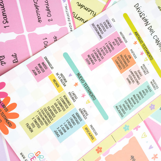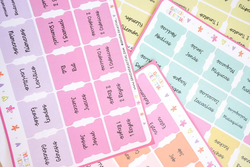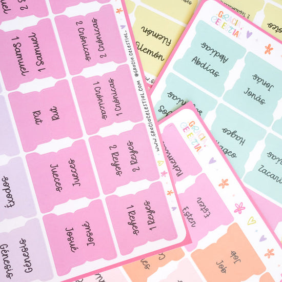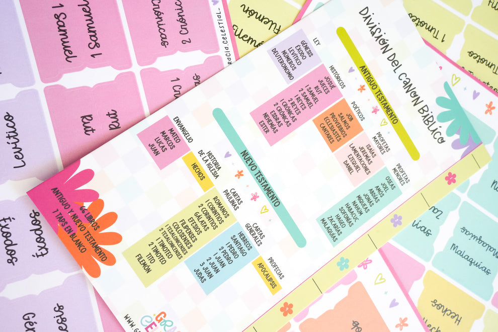 NuestrosTaps para Bibliasson la manera perfecta de marcar cada libro y encontrar tus pasajes favoritos con facilidad. Diseñados con colores hermosos, tipografía legible y adhesivo de alta calidad, estos separadores no solo son prácticos, sino también un detalle que embellece tu Biblia.