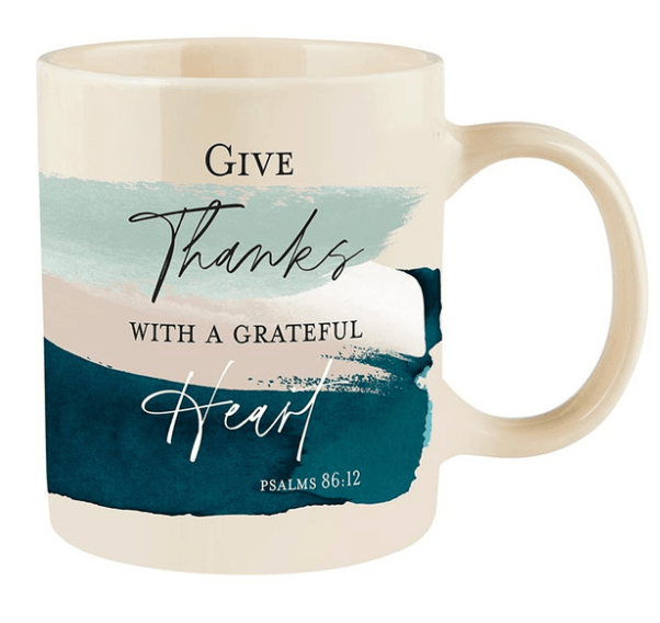 En la taza se puede leer: Da gracias con un corazón agradecido - Salmos 86:12