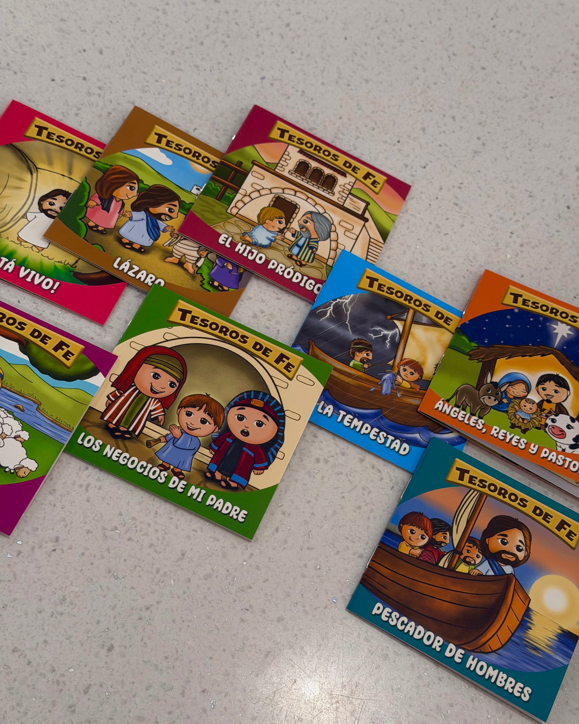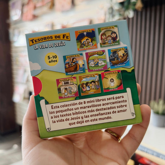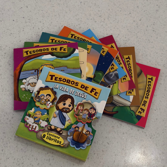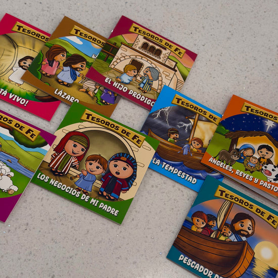 Set de Tesoros de Fe — 8 Minilibros guía a los más pequeños en un tierno encuentro con el corazón de Jesús, despertando la curiosidad espiritual y ayudando a comprender con dulzura el amor, la bondad y la esperanza que brotan de las Escrituras.