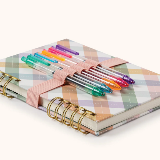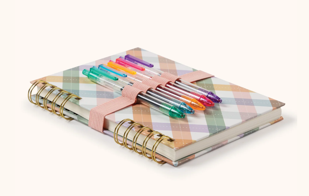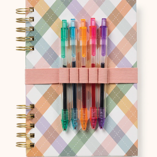 ¡Nunca pierdas otro bolígrafo otra vez! Este cuaderno de tapa dura de 192 páginas cuenta con convenientes lazos elásticos en la cubierta que vienen equipados con cinco bolígrafos multicolores; úsalos tal cual o cámbialos por tus favoritos personales. Ya sea que estés tomando notas en clase o planeando tu próxima gran aventura, ¡este diario mantiene tus herramientas de escritura justo donde las necesitas!• Viene con cinco bolígrafos de gel y un soporte de bolígrafo elástico, removible y reutilizable, que los sostiene a todos para que puedas escribir en cualquier lugar: en casa o en movimiento• Permite mezclar y combinar colores de tinta para adaptarse a tu estado de ánimo o tarea• Presenta un espiral dividido y único, permitiendo que el cuaderno se quede plano y haciendo que escribir sea fácil.