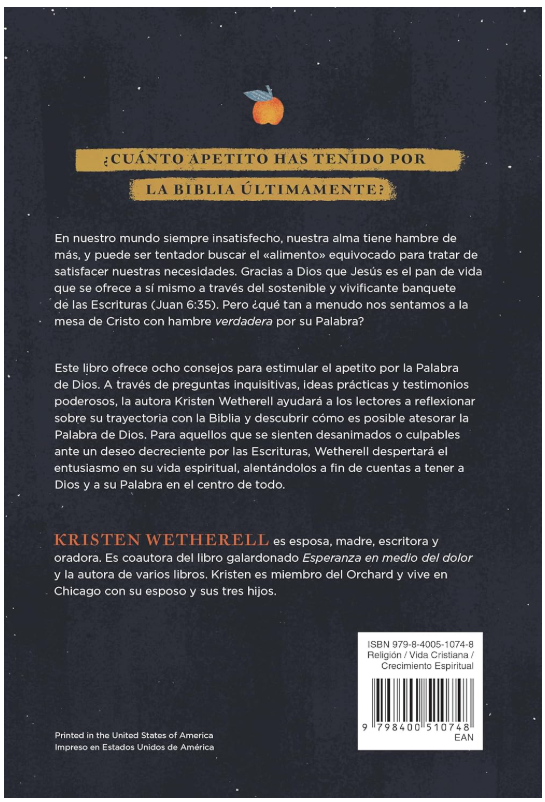 Ayuda para el alma hambrienta (Help for the Hungry Soul) offers encouragements to spur an appetite for God’s Word. Through searching questions, practical ideas, and moving testimonies, author Kristen Wetherell will help readers to reflect on their journey with their Bible and uncover how it is possible to treasure God’s Word. * Encourages Readers to Love God’s Word: Teaches why readers should treasure the Bible to spark enthusiasm for reading Scripture * Interactive Elements: This practical book provides reflection questions, habit trackers, and scriptural interaction to spur appetite for the word * Contains Anecdotal Stories: Each chapter ends with an individual’s unique testimony related to their personal journey with the Bible