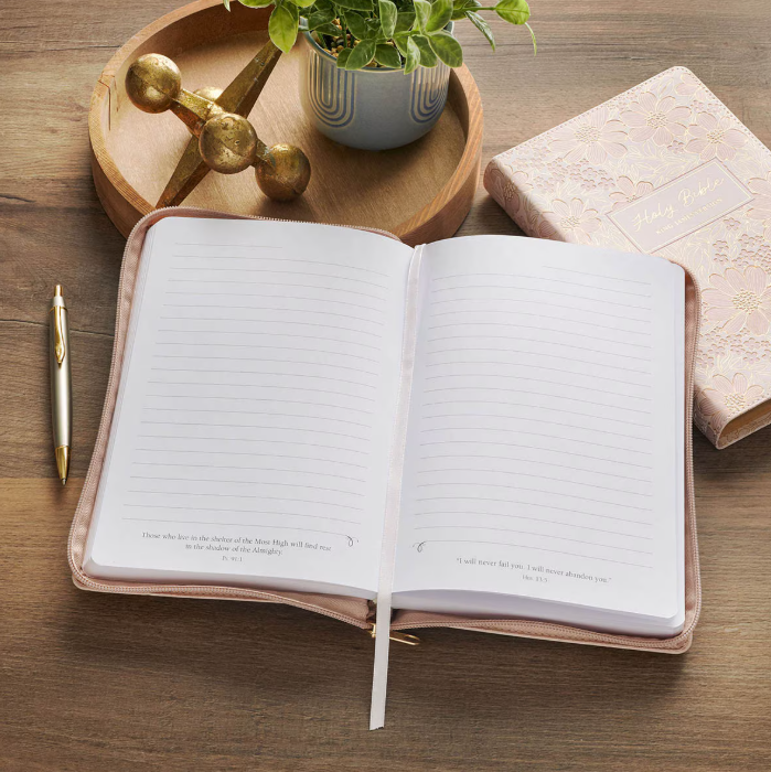 Con un delicado diseño floral en tonos rosa y la presencia de una mariposa que inspira renovación, este diario acompaña tus momentos de oración, reflexión y escritura. Incluye versículos bíblicos como semillas de meditación que pueden guiar tus oraciones y tu memorización, y su estética femenina lo hace un regalo lleno de cariño y significado para esa mujer que camina en la fe.