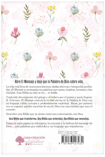 El Mensaje es la traducción al español de The Message, una versión de la Biblia traducida directamente del griego y el hebreo por el pastor y poeta Eugene H. Peterson. Por primera vez en español, esta obra conecta la verdad eterna de la Palabra de Dios con un lenguaje cálido, cercano y profundamente espiritual.