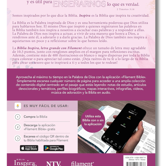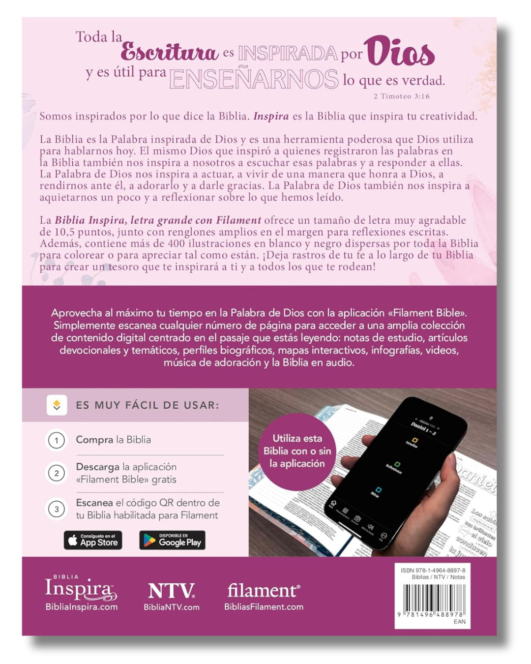 La Biblia Inspira NTV utiliza la expresión creativa para conectarte con Dios y con las Escrituras. Esta Biblia de una sola columna con amplio margen para anotaciones contiene más de 400 hermosas ilustraciones creadas por artistas latinoamericanos para colorear e inspirar la creatividad mientras lees la Palabra de Dios.