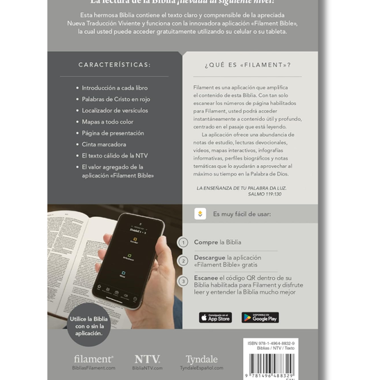 La Biblia NTV, presentada por Tyndale, invita a un encuentro íntimo y transformador con la Palabra de Dios. Con la integración de Filament, cada pasaje se abre como una puerta de comprensión y consuelo, permitiendo al lector sumergirse en las Escrituras con claridad y esperanza para el día a día.