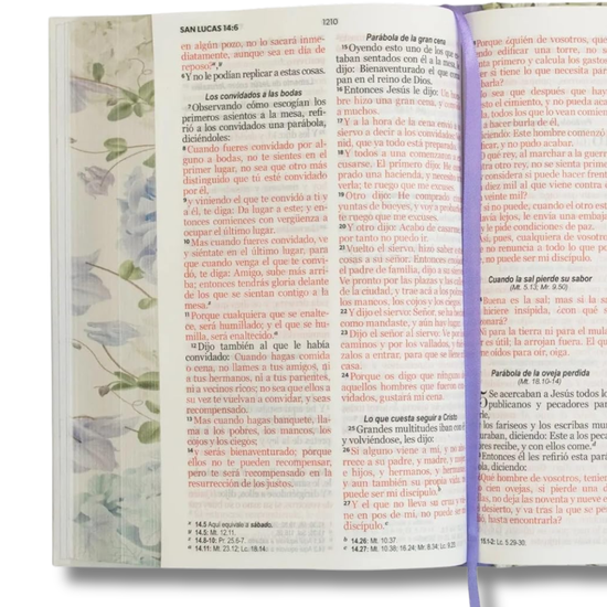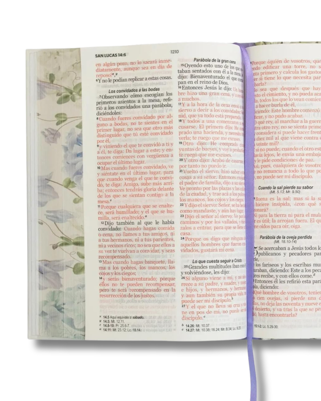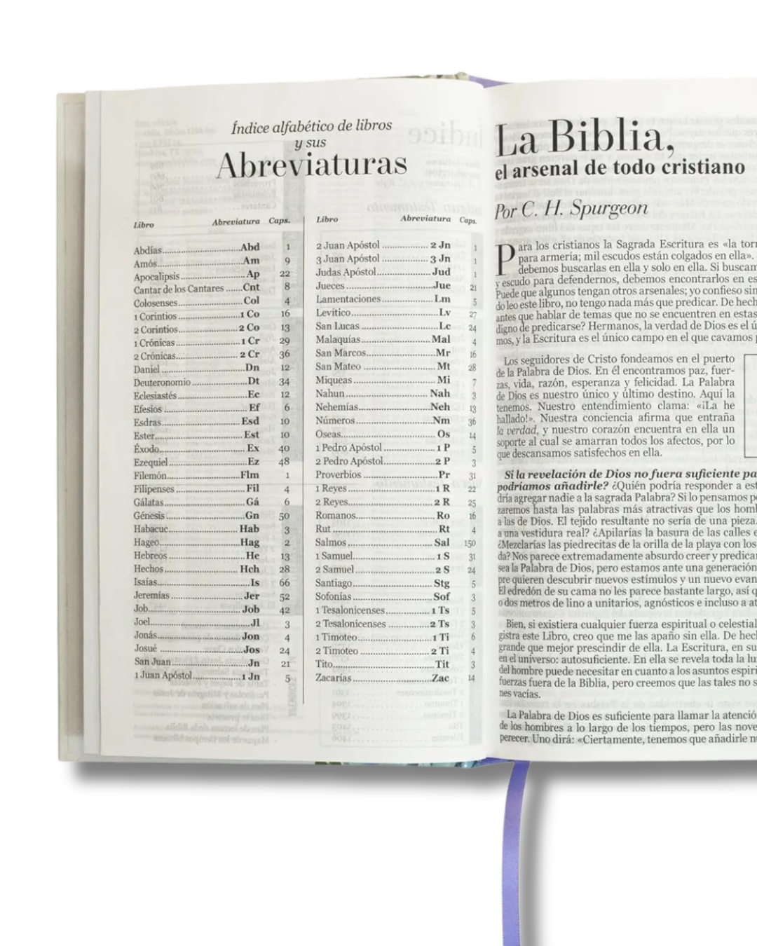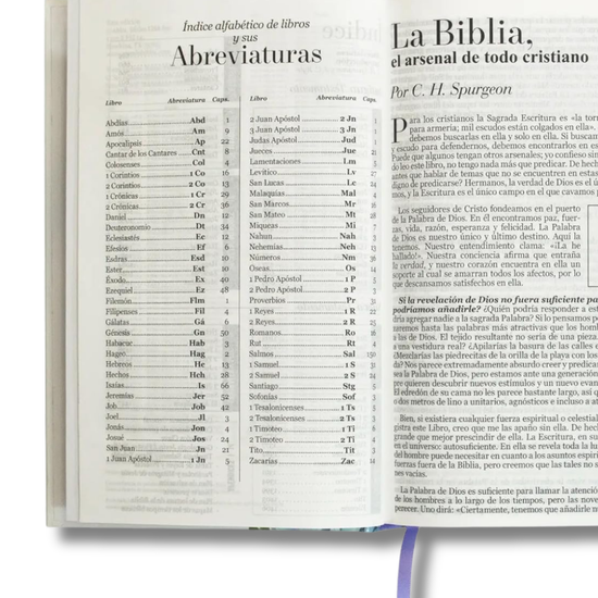 - Palabras de Jesús en rojo - Referencias cruzadas a pie de página. - Abreviaturas e Introducciones por C.H Spurgeon y J.C. Ryle - Concordancia de 120 páginas - Genealogía de Jesús/Fiestas Judías - Parábolas y Milagros de Jesús - Plan de salvación - Pasajes y versículos claves de la Biblia. - Plan de lectura Bíblica - Mapas de tiempos Bíblicos a todo color - 12 Mapas a todo color - Tipología de los salmos - Plano del templo - Cronología de reyes y profetas - Promesas de Dios
