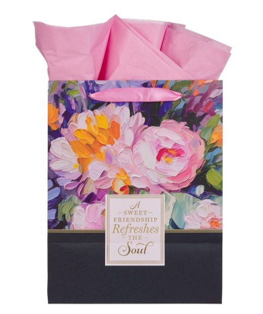 El diseño audaz y hermoso de la Bolsa de Regalo Grande con Retrato "Dulce Amistad Jardín de Acuarela" celebra el preciado vínculo de la amistad. Es la manera perfecta de presentar un regalo de agradecimiento o una sorpresa "porque sí".