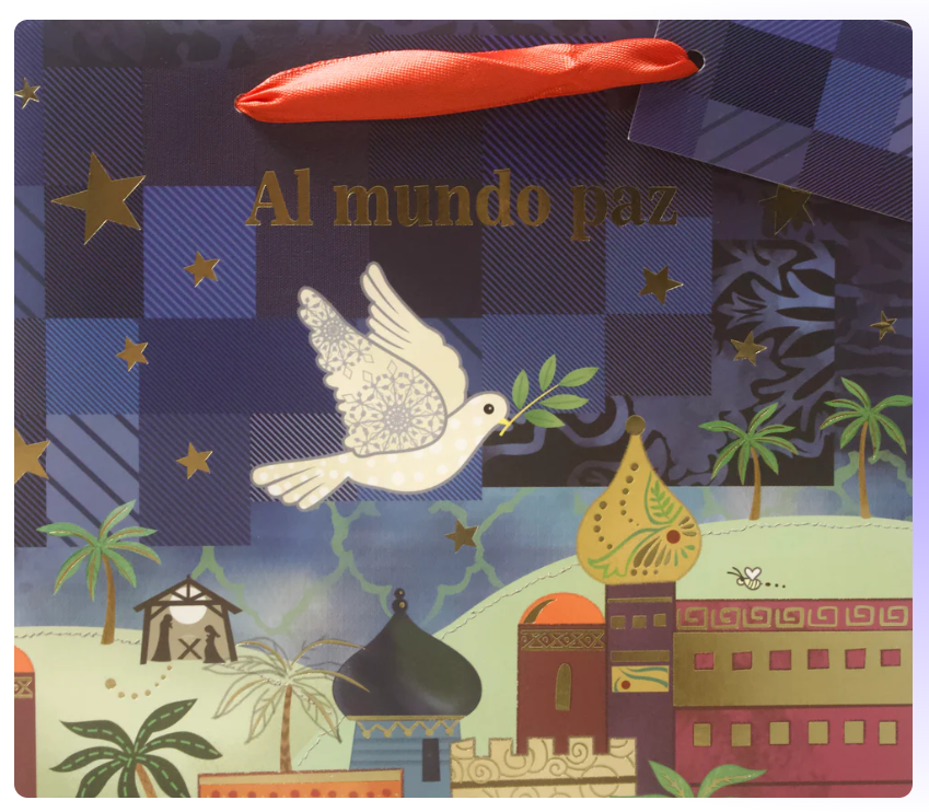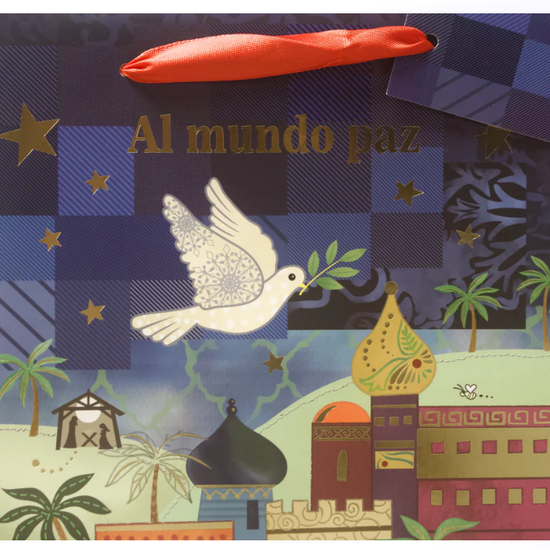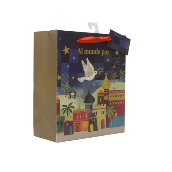 Esta bolsa de regalo mediana "Al mundo paz" es el detalle perfecto para envolver tus regalos con un mensaje de armonía y esperanza. Su tamaño ideal permite presentar obsequios de manera elegante y práctica, mientras que su diseño transmite un deseo de paz universal. Haz que cada regalo inspire sentimientos positivos y duraderos con esta bolsa que combina funcionalidad y significado en cada ocasión.