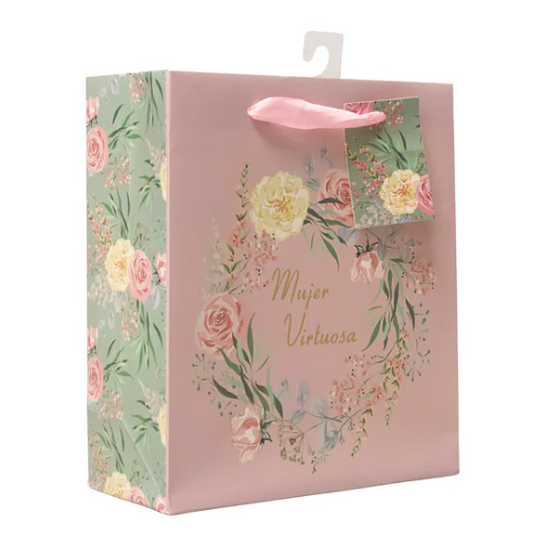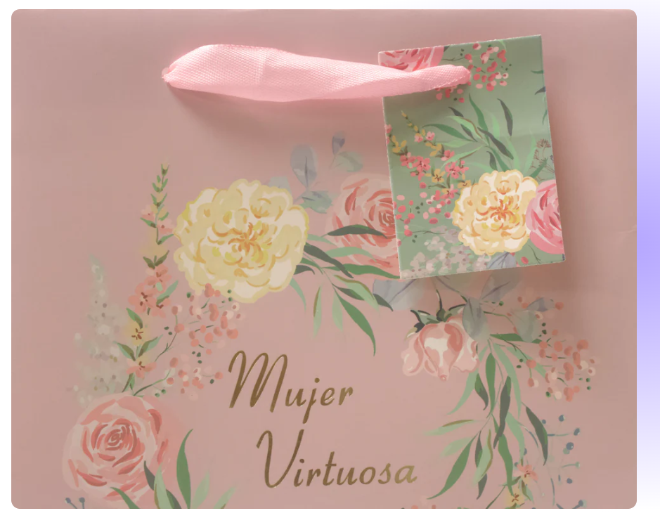 Esta bolsa de regalo mediana “Mujer virtuosa” en tono rosado con delicadas flores es el detalle perfecto para expresar admiración y cariño. Su tamaño ideal permite presentar obsequios con elegancia y estilo, mientras que su diseño floral evoca feminidad y buen gusto. Convierte cualquier regalo en un momento especial con esta bolsa que celebra la belleza y fortaleza de la mujer virtuosa.