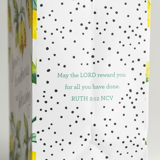 Esta bolsa de regalo cristiana envuelve tu regalo con estilo y alegrará el día de alguien con la alentadora bendición de las Escrituras. Las asas de cinta de raso, la purpurina y las hojas temáticas a juego hacen de esta bolsa de regalo inspiradora una de las favoritas para envolver regalos.