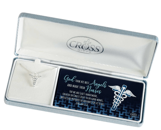 Cruz Caduceo Plateado Mide 13/16in L Y Tiene Una Bala Oculta. Cuelga en una cadena plateada de 18in y está en una caja con bisagras con un inserto que lee - Dios tomó a sus ángeles y los hizo enfermeras junto con Efesios 2:10 Porque somos obra de Dios, creados en Cristo Jesús para hacer buenas obras, que Dios preparó de antemano para nosotros hacer.