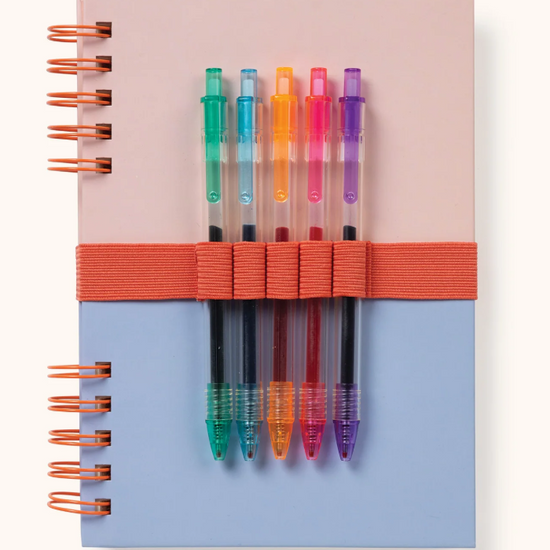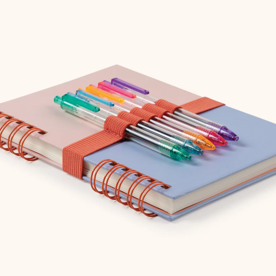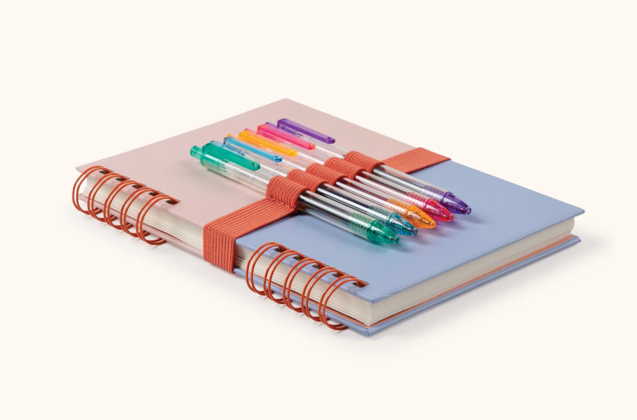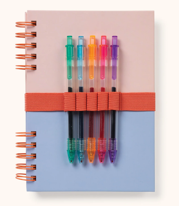 ¡Nunca pierdas otro bolígrafo otra vez! Este cuaderno de tapa dura de 192 páginas con papel de 100 gsm cuenta con convenientes lazos elásticos en la cubierta que vienen equipados con cinco bolígrafos multicolores; úsalos tal cual o cámbialos por tus favoritos personales. Ya sea que estés tomando notas en clase o planeando tu próxima gran aventura, este diario mantiene tus herramientas de escritura justo donde las necesitas.• Viene con cinco bolígrafos de gel y un soporte de bolígrafo elástico extraíble y reutilizable que los sostiene a todos, para que puedas escribir en cualquier lugar: en casa o en movimiento.• Permite mezclar y combinar colores de tinta para adaptarse a tu estado de ánimo o tarea.• Presenta un espiral dividido único y elegante, lo que permite que el cuaderno se mantenga plano y facilita la escritura.