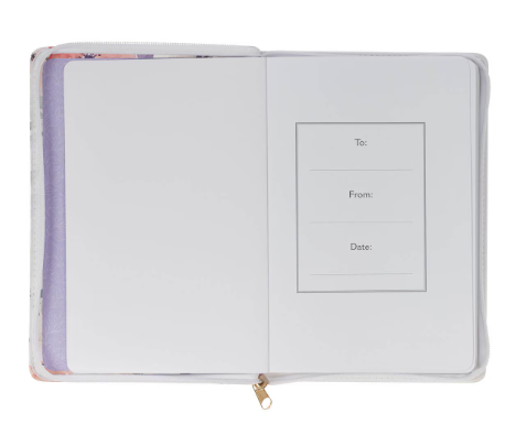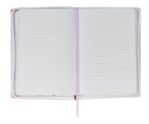 La costura superior blanca resistente a lo largo de los bordes y las costuras aumenta la durabilidad del diario, mientras que un marcador de cinta satinada lila permite una fácil navegación por su contenido. La cremallera blanca, con un tirador de metal en oro rosa, asegura que las páginas y cualquier nota suelta dentro se mantengan seguras y en perfecto estado.