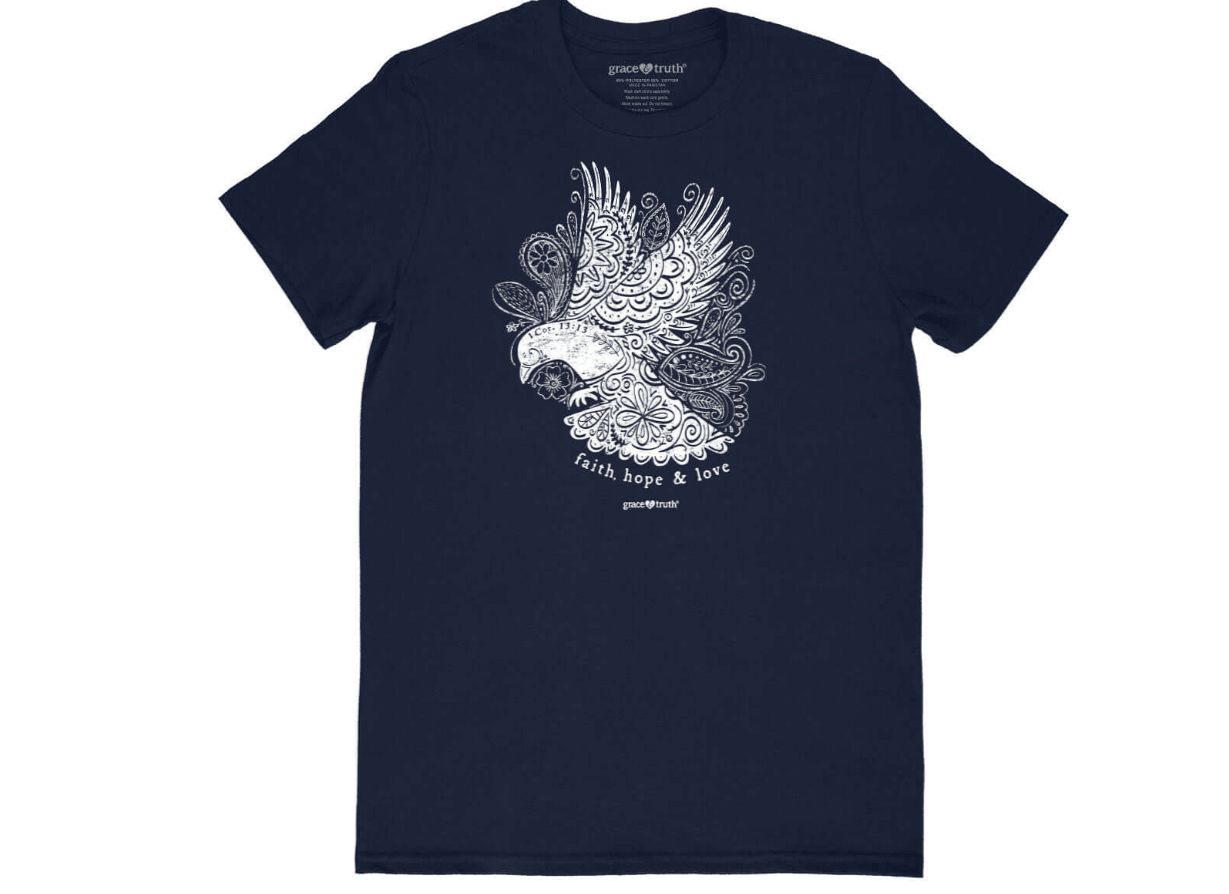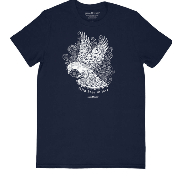Haz una declaración de fe artística con esta elegante camiseta «FHL Dove» de grace & truth® en azul marino. La fe nos libera para volar por la vida con fe, esperanza y amor por el camino.