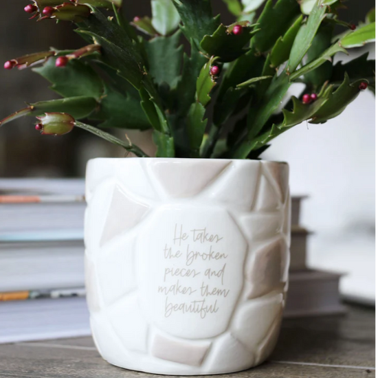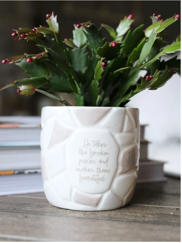 Tal como la promesa del Señor en Eclesiastés 3:11, la Maceta Alma Reparada transmite la belleza del proceso de sanación de la vida. Al unir sus fragmentos rotos en un hermoso diseño de mosaico, esta maceta representa cómo Dios toma nuestras piezas rotas y nos reconstruye, pieza por pieza, llenando las grietas con su amor.