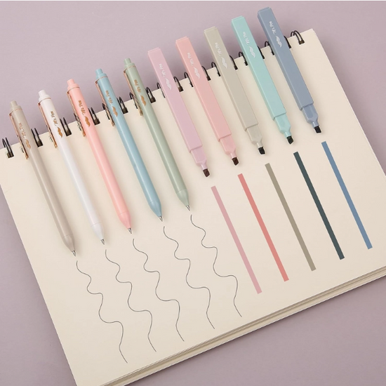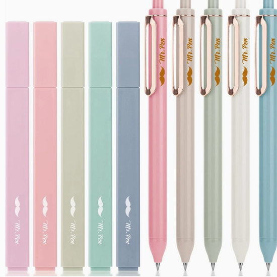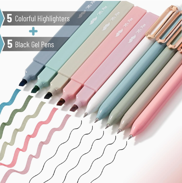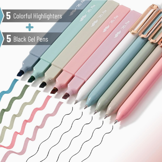 El set de resaltadores y bolígrafos Mr. Pen incluye 10 piezas, con 5 resaltadores de colores vibrantes y 5 bolígrafos de gel negros, ofreciendo versatilidad tanto para escribir como para resaltar. * Los resaltadores tienen punta biselada para líneas anchas y finas, mientras que los bolígrafos cuentan con tinta negra de flujo suave, siendo perfectos para tomar notas, organizar y proyectos creativos.* Cada bolígrafo y resaltador está diseñado con un agarre cómodo, asegurando una experiencia agradable al escribir y resaltar, incluso durante un uso prolongado.* La tinta tanto de los bolígrafos como de los resaltadores es de secado rápido y resistente a manchas, proporcionando resultados limpios y nítidos en todo momento.* Este elegante set, con su paleta de colores pastel, es ideal para estudiantes, profesionales y cualquier persona que disfrute de una colección de material de papelería coordinada y funcional.