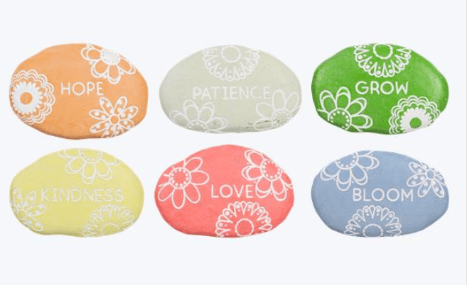 Incluye seis piedras con una palabra impresa y un diseño floral
