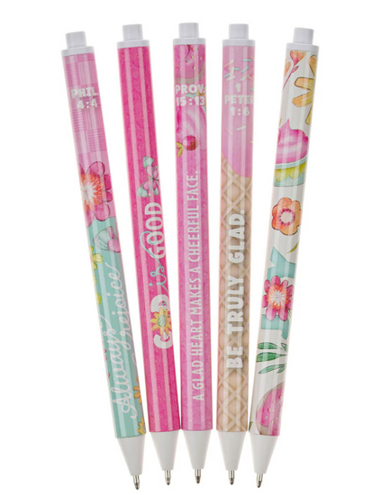 Flowers, butterflies, and Scripture sentiments make these pens exciting for her to use for any notetaking needs. Each of these five pens features a pastel pink, blue, or multi-colored pastel design accented with flowers, butterflies, ice cream cones, and cupcakes. Each pen has a delightful message for her to enjoy while writing.