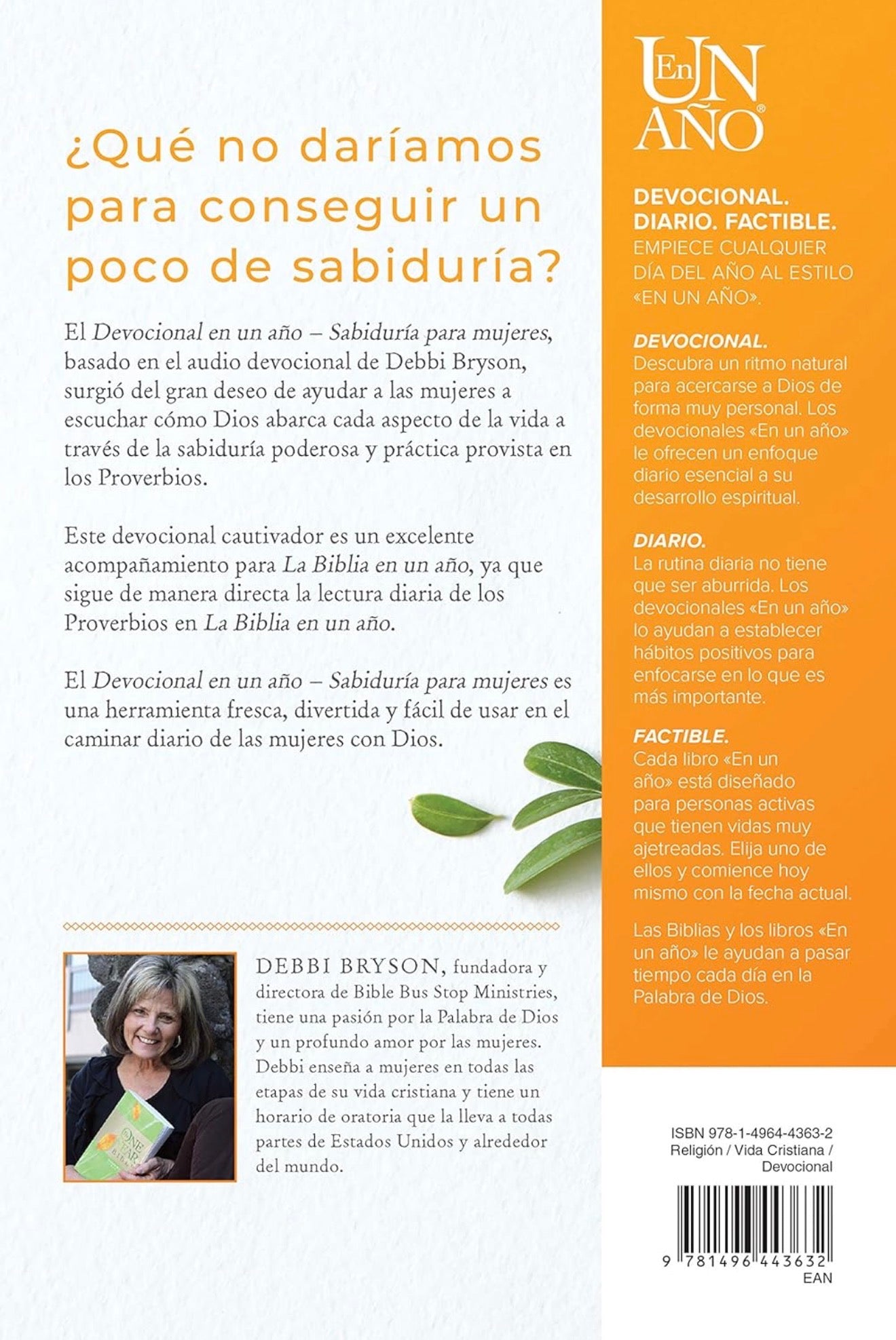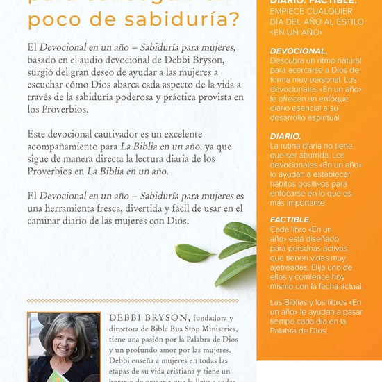 Vivimos en un mundo necio donde las mujeres toman malas decisiones y sufren el daño colateral de las malas decisiones de otros. El Devocional en un año – Sabiduría para mujeres nació de la gran necesidad que tienen las mujeres de escuchar cómo Dios aborda cada faceta de la vida a través del poderoso y práctico libro de Proverbios. Para muchos, el libro de Proverbios es difícil de estudiar porque los versículos saltan de un tema a otro. El Devocional en un año – Sabiduría para mujeres es una herramienta práctica que ayudará a las mujeres en su caminar diario con el Señor. Es perfecto para acompañar a la Biblia en un año porque sigue esa lectura diaria de Proverbios. Cada día hace referencia al plan de lectura de la Biblia en un año y termina con un poderoso llamado a la acción.