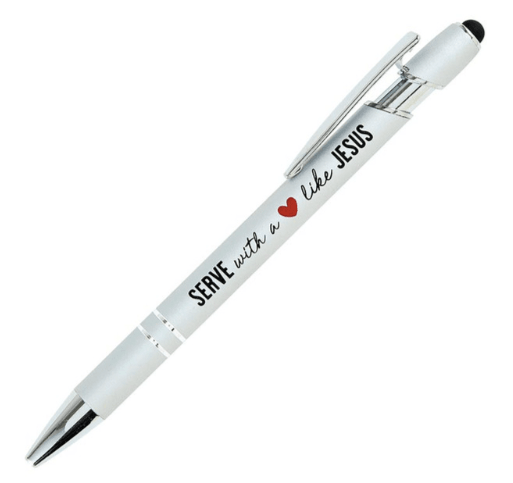 Este bolígrafo de escritura suave incluye las palabras «Sirve con un corazón como Jesús» - Josué 22:5, ¡y seguro que se convertirá en tu bolígrafo favorito! Cada bolígrafo tiene una punta en un extremo Precio perfecto para regalar en reuniones de voluntarios y de servicio