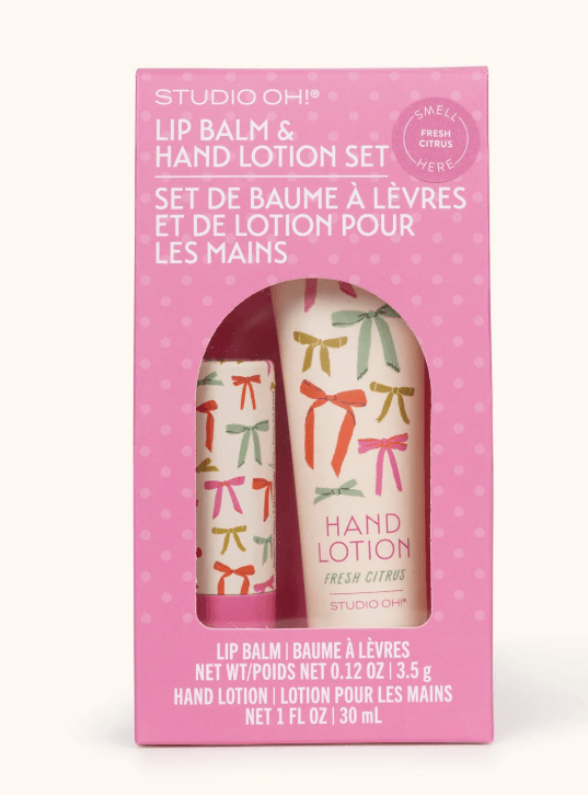 El set de bálsamo labial y loción para manos de Studio Oh! Incluye una crema de manos y un bálsamo labial de 1 oz empaquetados en una bolsa transparente y reutilizable. El bálsamo labial sin perfume ayuda a hidratar suavemente y suavizar los labios secos, mientras que la loción de manos perfumada hidrata las manos y las cutículas. El conjunto de dos piezas tiene un diseño ingenioso y es perfecto para llevarlo en un bolso o regalar a un amigo.