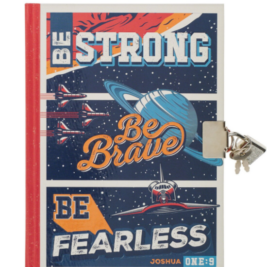 El Diario Secreto Fuerte y Valiente forma parte de la Colección Espacial Be Brave Boy. Incluye una funda bíblica moderna, una botella de agua de acero inoxidable, una segunda botella de agua de acero inoxidable con pegatinas, un juego de notas para la lonchera, una bolsa de regalo, un rompecabezas de 140 piezas, un estuche de silicona, un juego de pegatinas surtidas, un rollo de pegatinas, un juego de bolígrafos retráctiles, un cuaderno grande, un diario secreto, un bloc de agenda mediano, un juego de marcapáginas de cartulina, un juego de marcapáginas magnéticos y un marcapáginas de cartulina premium.